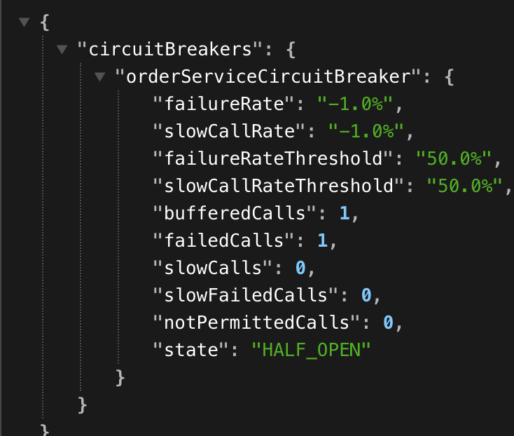 - 이 상태에서는 원래의 order() 메서드를 호출하지 않고, 즉시 fallback 메서드를 실행한다.(Fail-Fast)