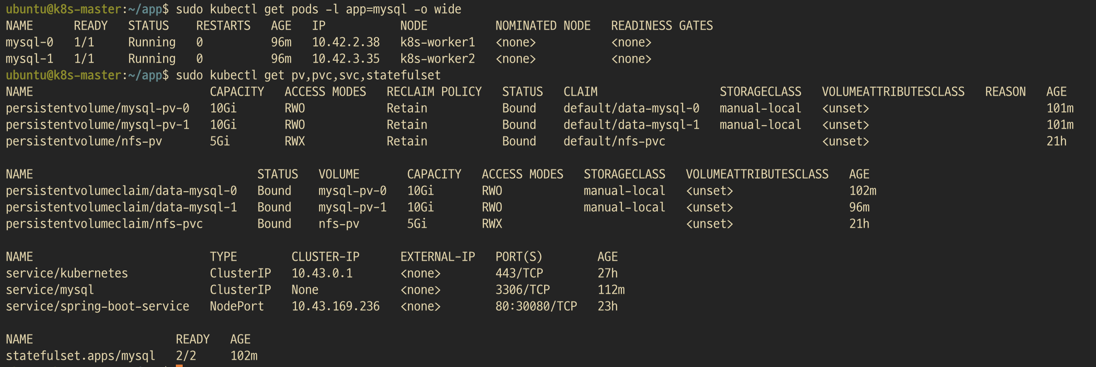 - volumeClaimTemplates: 이 설정 덕분에 mysql-0은 mysql-pv-0을, mysql-1은 mysql-pv-1을 자동으로 찾아가 바인딩된다. 결과적으로 데이터가 있는 물리 노드에 포드가 딱 붙어서 실행된다.