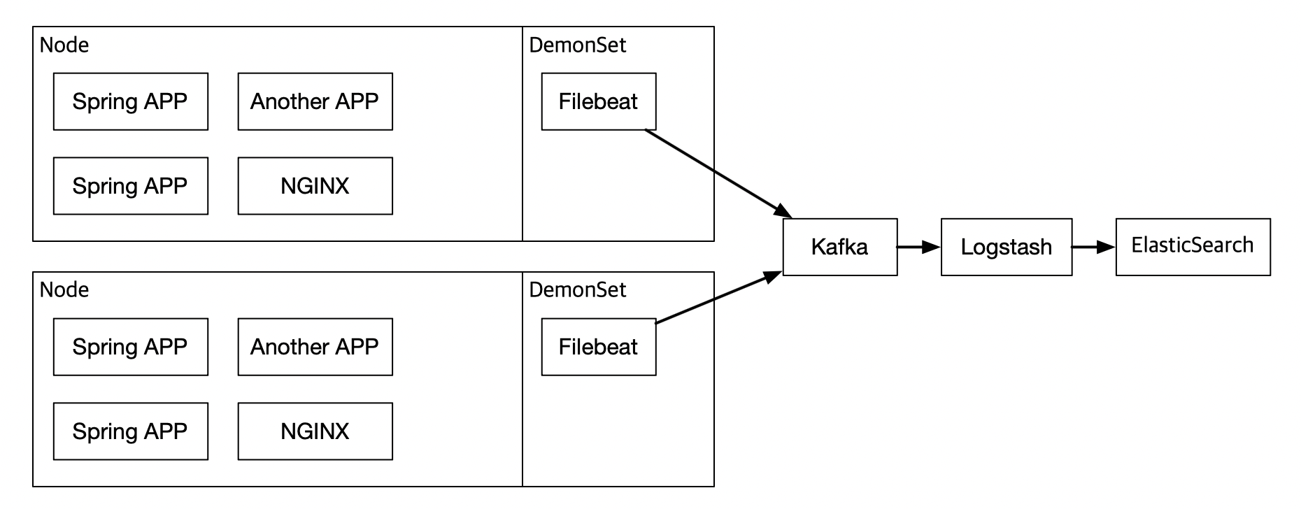 - 노드당 하나의 Filebeat: 앱이 몇 개가 되던, 데몬셋은 각 노드(서버)에 딱 하나의 Filebeat만 띄운다.
