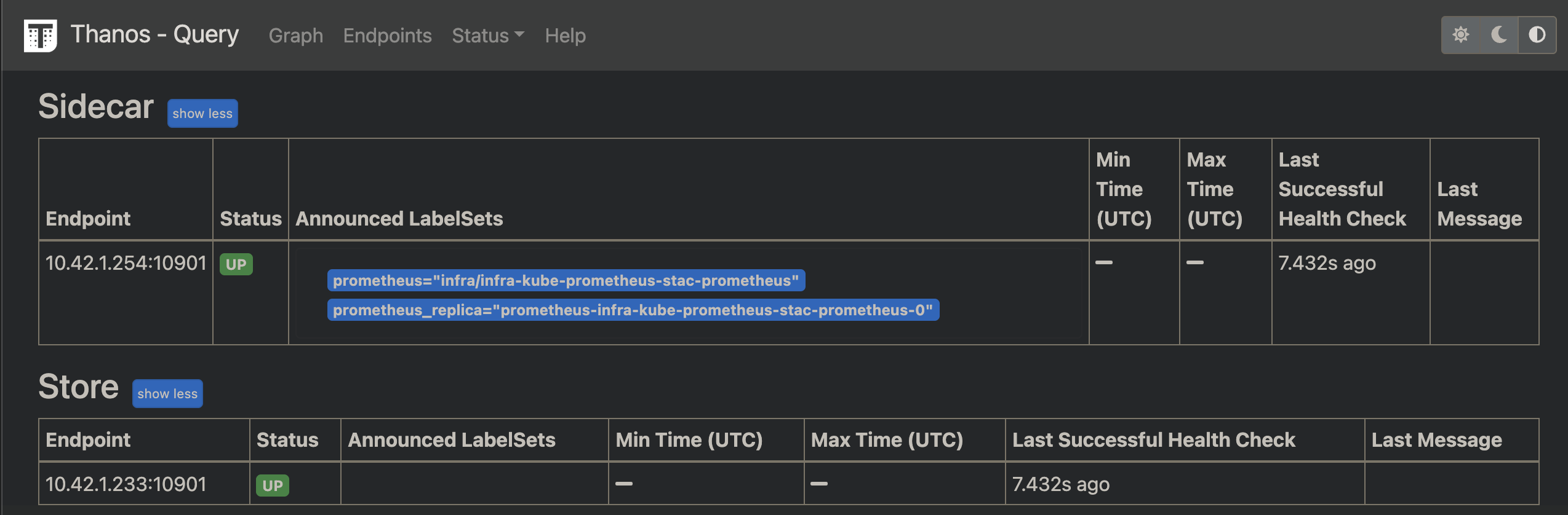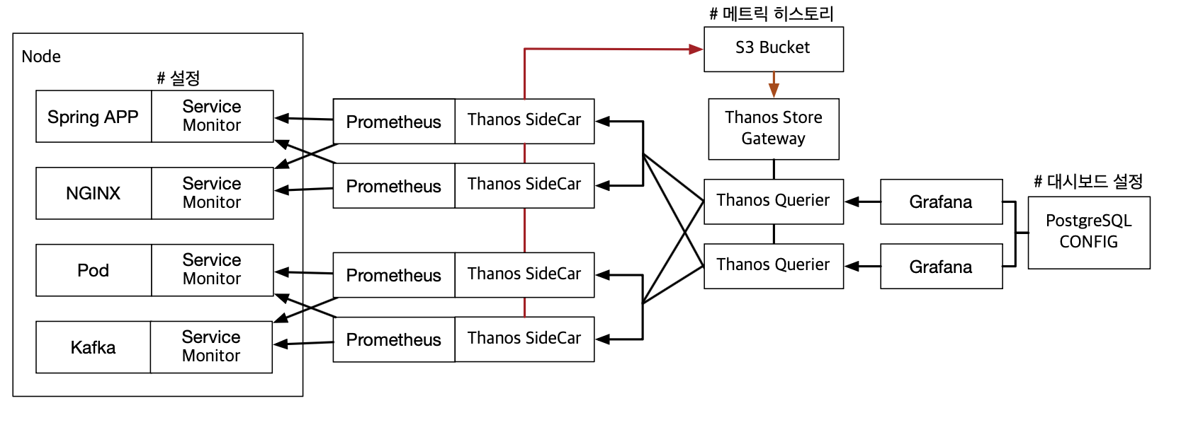 values.yaml 설정을 통해 프로메테우스에 타노스 사이드카를 심고, 쿼리어를 통해 통합 조회가 가능하도록 구성한다.