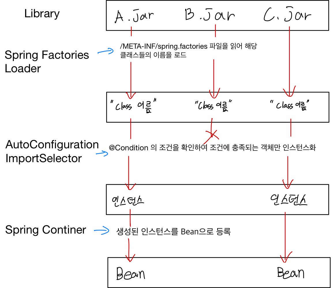 그 후, classpath 내의 jar파일을 스캔하여 spring.factories 파일을 찾고, 이 파일 내에 명시된 모든 AutoConfiguration 클래스를 로드합니다.