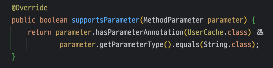 1. supportsParameter: 이 메서드는 컨트롤러의 특정 파라미터를 ArgumentResolver가 지원하는지 여부를 판단하는 역할을 합니다. 만약 true를 반환하면 해당 ArgumentResolver의 resolveArgument 메서드가 실행됩니다.