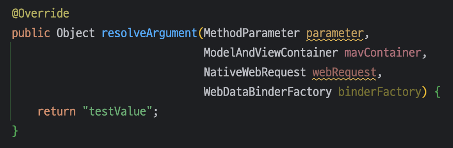 2. resolveArgument: 이 메서드는 실제로 파라미터의 값을 리턴하는 역할을 합니다. 이 값을 반환하면 DispatcherServlet은 이 값을 해당 파라미터에 바인딩합니다.