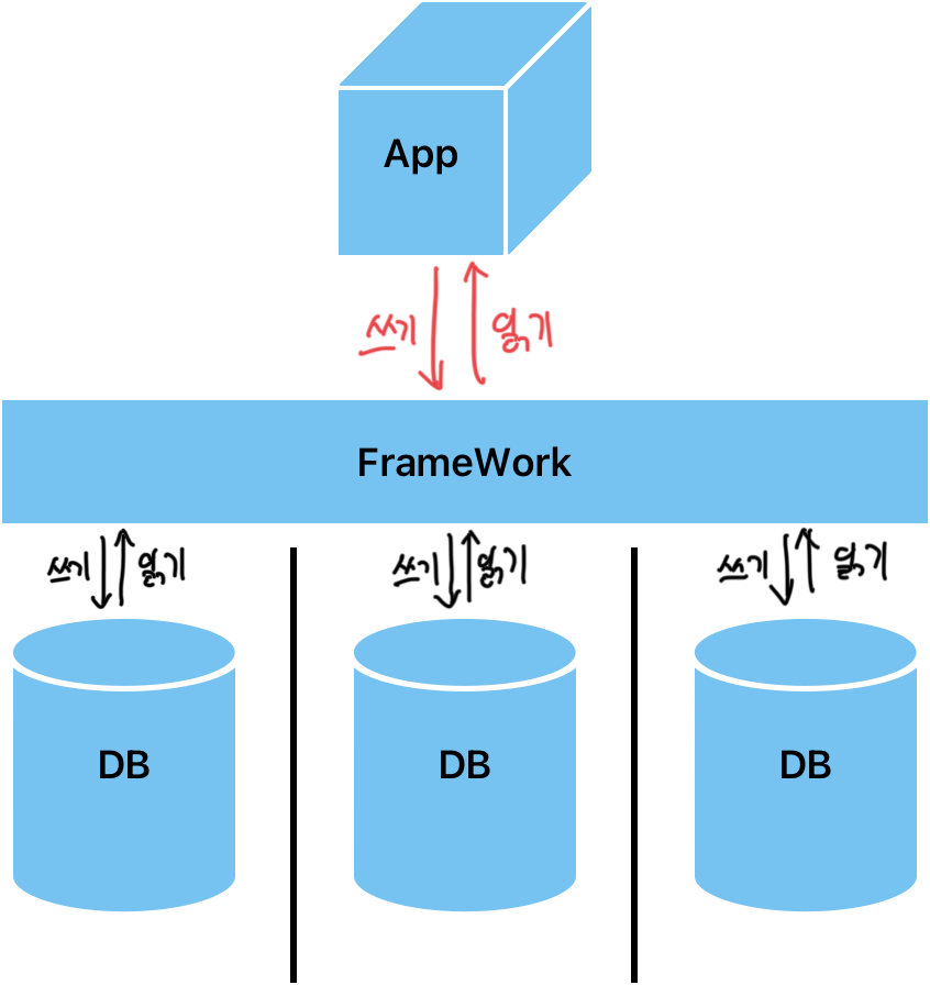 또한 1, 2, 3번의 데이터가 각각 1, 2, 3번의 DB에 존재한다면 한번의 트랜젝션으로 데이터를 가져올 수 없으므로, 분산 트랜잭션 처리 메커니즘을 만들어야 합니다.