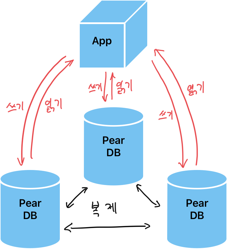 데이터 복제는 리플리케이션과 유사한 개념이나 약간의 차이가 있습니다. 리플리케이션은 Master - Slave 관계로 DB를 구성했다면, 데이터 복제는 Peer - Peer 방식으로 DB를 구성합니다. 모든 노드는 모두 읽기/쓰기를 지원하며, 쓰기 작업을 한 데이터만 서로 복제하는 방식입니다. 이 방식은 하나의 DB에 장애가 나더라도 서비스 중단 없이 운영이 가능하며 "내결함성"을 높힐 수 있는 방법입니다.