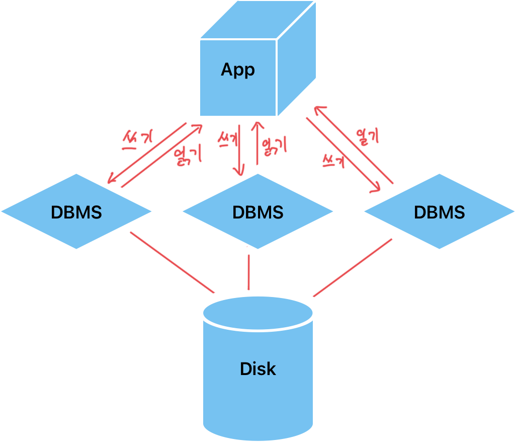 Shared-Everything 아키텍처는 하나의 공유 디스크에 여러 개의 DBMS 인스턴스가 접근하는 방식을 가리킵니다. 이 방식에서는 모든 DBMS 인스턴스가 동시에 읽기와 쓰기 작업을 처리할 수 있으므로 성능이 좋을 수 있습니다. 그러나 동시성 문제나 공유 디스크의 병목 현상이 발생할 수 있어서, 대규모 시스템에서는 확장성에 제한이 있을 수 있습니다.