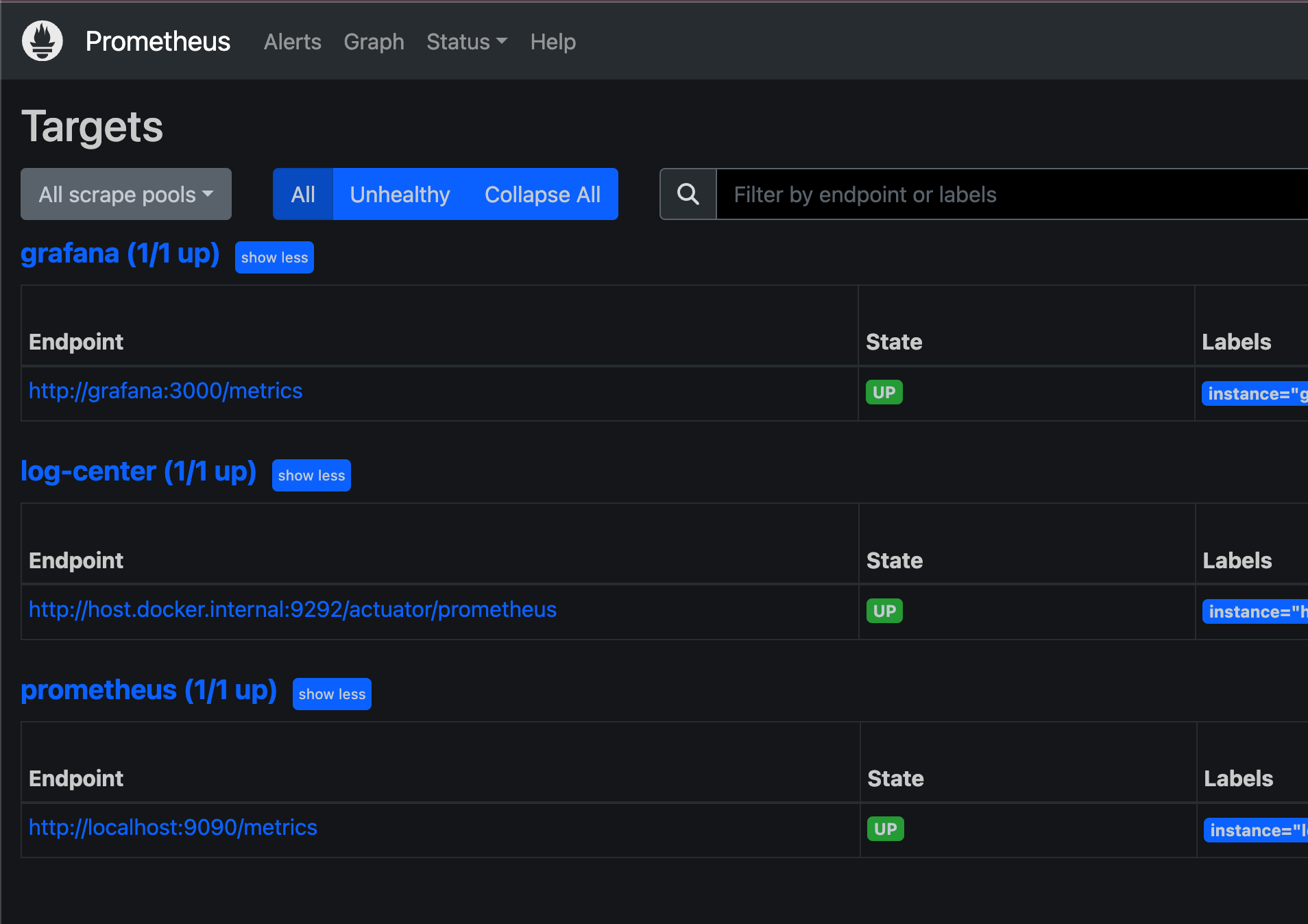 State가 UP이라고 뜬다면 서비스가 정상 연동 된겁니다. 만약 Down으로 표시된다면 prometheus.yml 를 다시 설정해주세요.