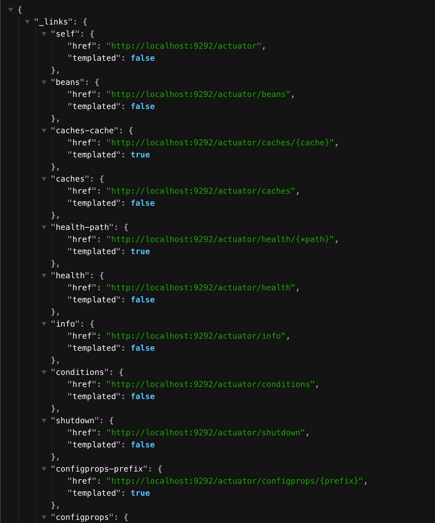 서비스를 기동하고 http://localhost:9292/actuator 를 웹 또는 postman으로 들어가보면 여러 링크들을 볼 수 있습니다.