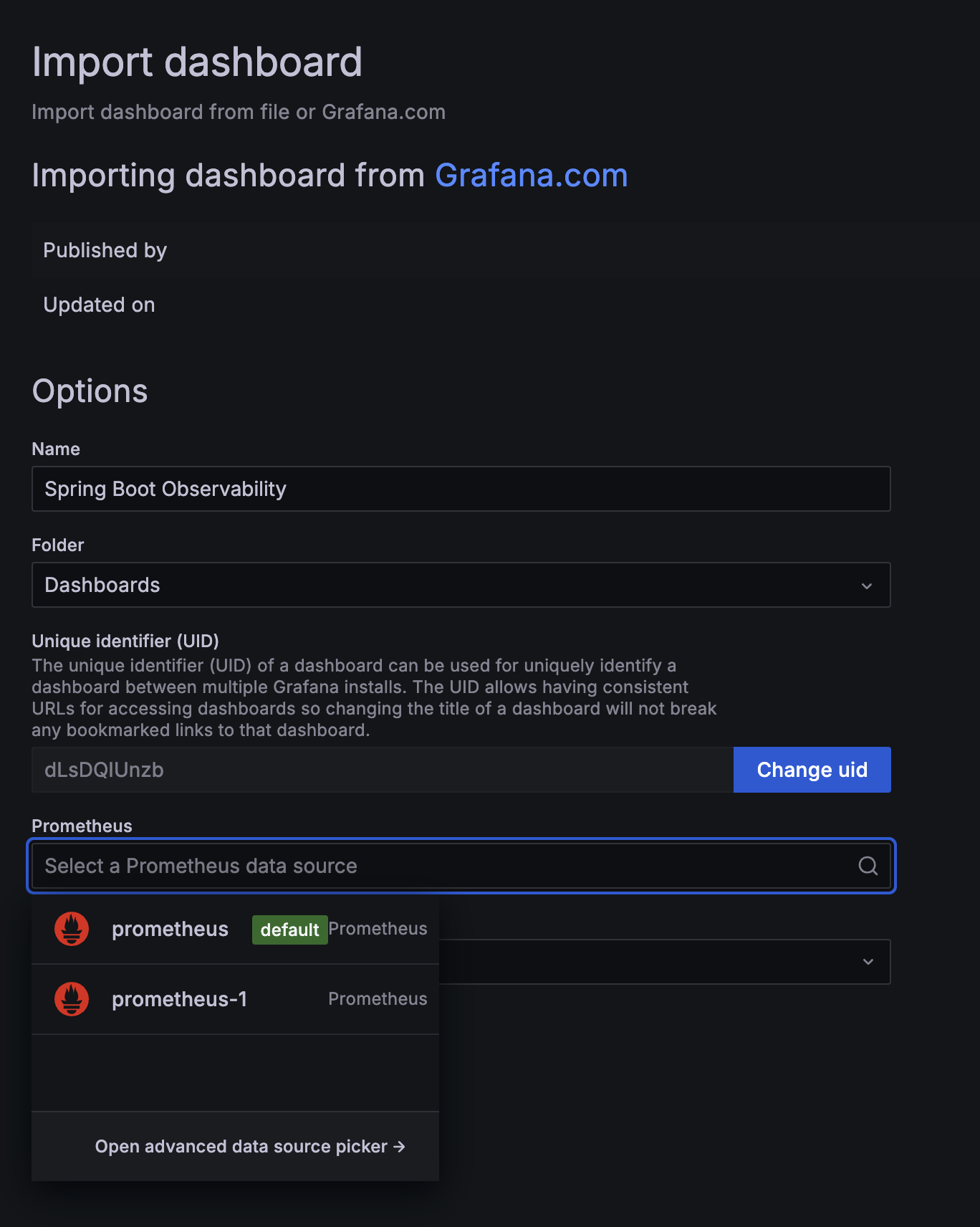 id를 입력하고 'Load' 버튼을 누르면 아래와 같은 창이 나옵니다. 연동했었던 Prometheus를 선택해주세요.