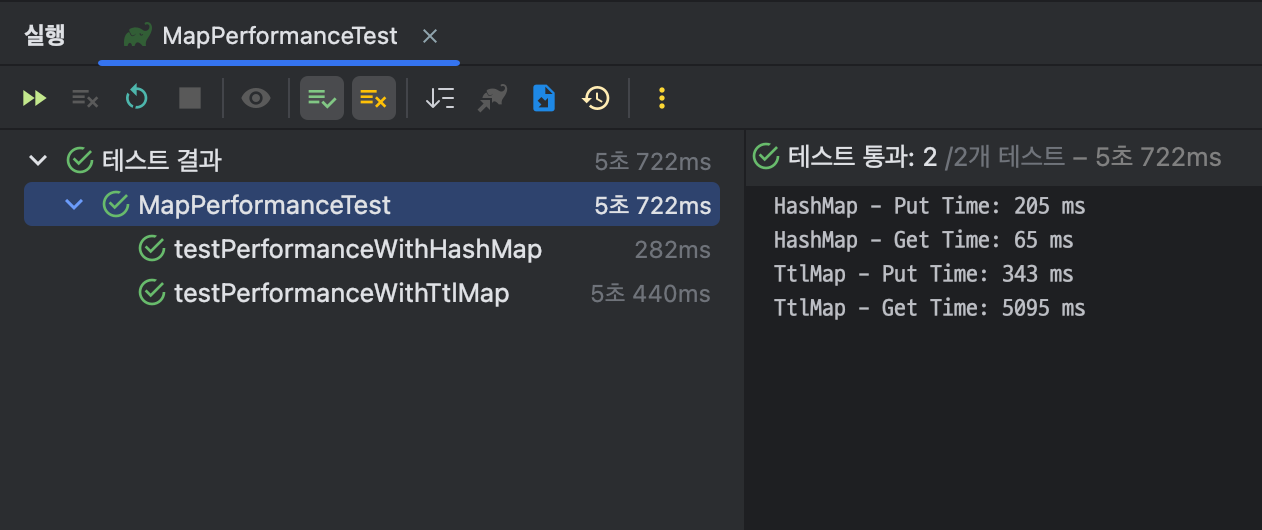 TtlMap의 성능이 초기에는 낮게 측정되었습니다. 그 이유는 entrySet()을 오버라이드할 때 발생하는 잦은 반복 작업으로 인해 성능이 저하되었기 때문입니다. 이를 해결하기 위해 필요한 메서드인 put과 get만을 오버라이드하고 나니 성능이 크게 개선되었습니다.
