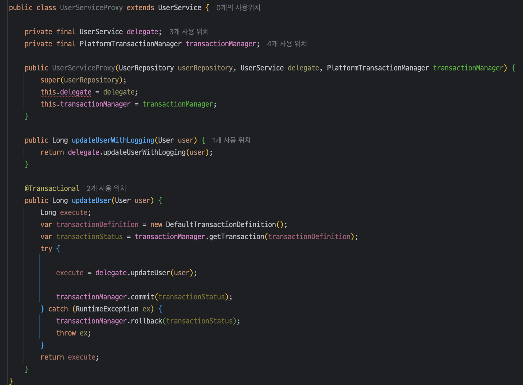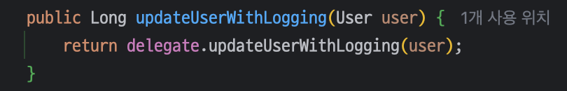 UserServiceProxy 인스턴스에서 delegate.updateUserWithLogging(user) 를 호출합니다.