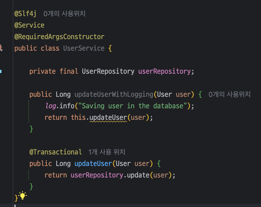 "어노테이션을 붙였는데 값이 업데이트되지 않지? AOP가 작동하지 않지?" 같은 상황입니다.