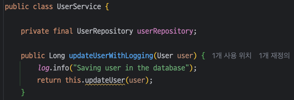updateUserWithLogging() 메서드를 호출하면 로그는 정상적으로 출력되지만,