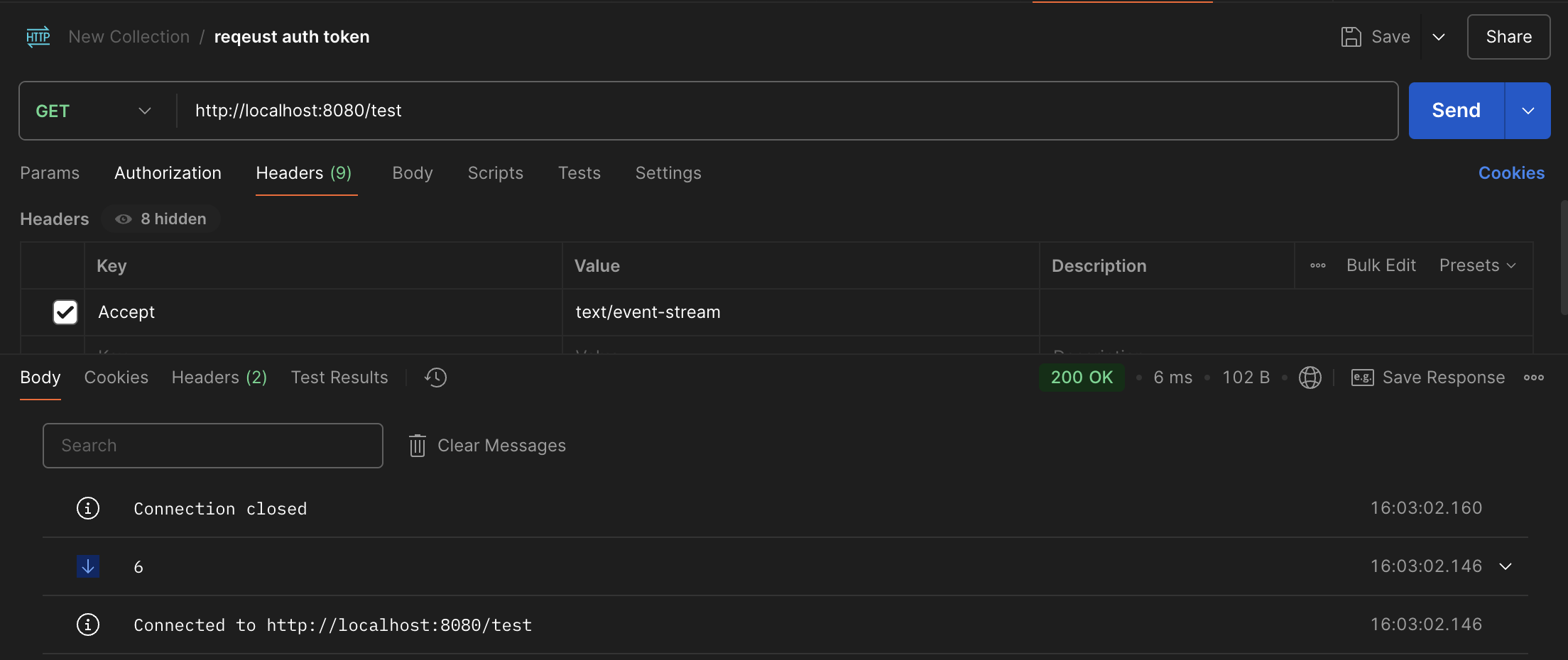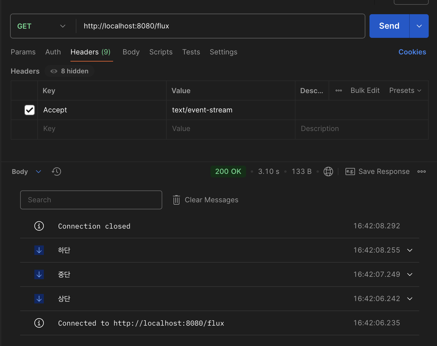 Server-Sent Events(SSE) 방식일 땐 postman 요청을 보낼때 꼭 "Accept: text/event-stream" 헤더를 추가해야합니다.